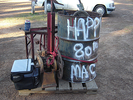 of scrap metal with a "birthday wish" painted on the 44 gallon drum. Mac who